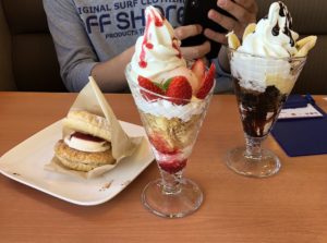 パフェ2個とハンバーガーみたいなケーキを1個。〆にアイスクリームを3個食べてご満悦でした。食べ盛りとはいえ、この量には驚きました。