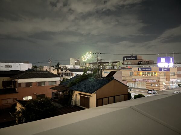 どーんと爆発音を聞いてから、「なにごと?」ごそごそ階段を上がり、「あ 花火大会なんだ」というヤジウマレベルの鑑賞です。