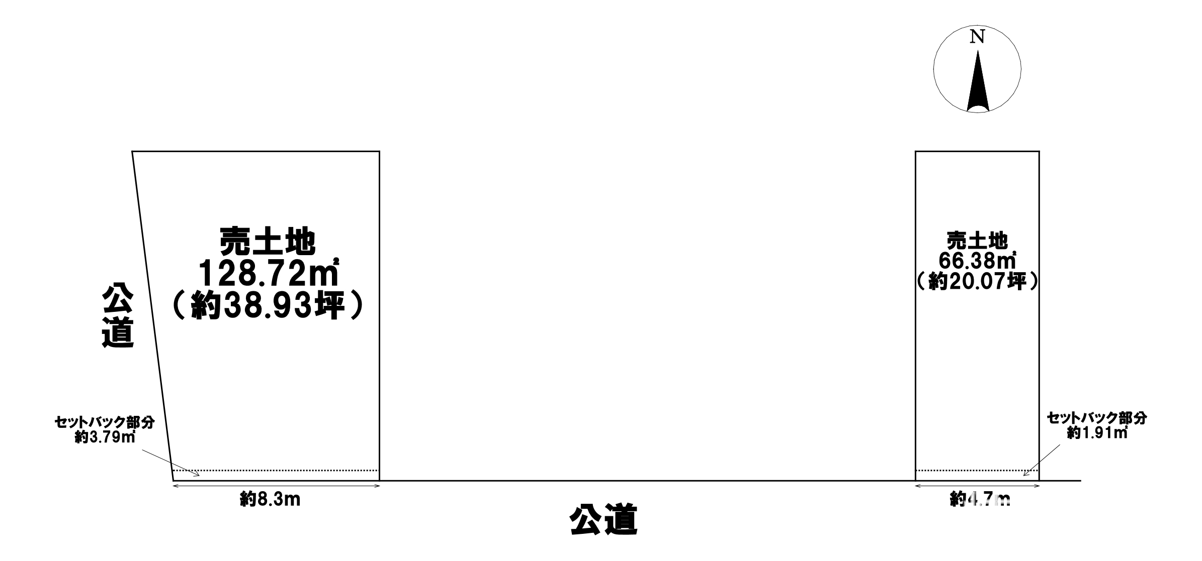 用途地域は第1種中高層住居専用地域。中高層住宅の良好な環境を守るための地域で、病院、大学、500㎡までの一定のお店、500㎡以下のスーパーも建てられる地域です。名鉄尾西線「町方」駅まで徒歩約8分。通勤・通学に便利な立地。住宅やお寺・小さな公園もあり、静かで過ごしやすい住環境。土地面積は約128.72㎡、約66.38㎡。建ぺい率60%・容積率200%。西側幅員約5.9mの道路に約12.79m接道、南側幅員約3.0mの道路に約8.30m接道、南側幅員約3.2mの道路に約4.77m接道しています。前面道路が4m未満なので、セットバックが必要です。約38.93坪、約20.07坪とコンパクトなお土地です。ハッピーさおりまで約280m、ゲンキー藤浪店まで約1200m、篠田内科まで約1200m(車で約5分)など、各種生活施設は徒歩約17分圏内に揃っている生活に便利な住環境です。国道155号線まで約1200m(車で約4分)、大治北料金所まで約8200m(車で約24分)。草平小学校まで徒歩約23分、佐織中学校まで徒歩約16分と子育て世帯にも嬉しい環境です。2沿線利用可能で通勤・通学に便利な立地です。
