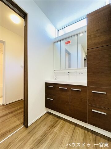 この物件は名鉄犬山線「江南」駅から徒歩約20分、愛知県江南市高屋町旭にある「江南市高屋町旭 新築分譲住宅」全2棟の1号棟です。周辺は第一種住居地域に該当し、住居の環境を守るための地域で、3000㎡までの店舗・事務所・ホテルなどが建てられるエリアです。大阪屋ショップ江南店まで約270m、クリエイトSD江南高屋店まで約210m、こうなんクリニックまで約740mなど、各種生活施設が周辺に揃っています。古知野東小学校まで徒歩約13分、古知野中学校まで徒歩約10分です。敷地は約131.72㎡(約39.84坪)、南側幅員約11.8mの道路に約6.80m接道。建物は木造2階建て・延床約105.3㎡(約31.85坪)の3LDKで、駐車スペースは普通車2台分確保されています。室内設備はシステムキッチン・食器洗浄乾燥機・カウンターキッチン・浴室暖房・浴室乾燥機・追焚機能・温水洗浄便座・全居室収納・ウォークインクローゼット・インナーバルコニーなど充実しており、耐震構造、南向きで陽当たり・通風良好です。建築確認番号は第KS125-0420-53312号で、完成は2025年10月上旬予定です。