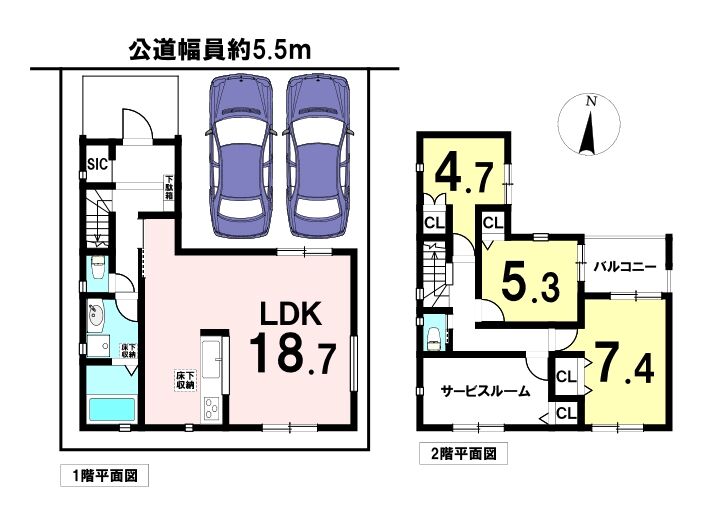 この物件は名古屋臨海高速鉄道「中島」駅から徒歩約12分、愛知県名古屋市中川区小碓通2丁目にある「ミラスモ名古屋市中川区小碓通2丁目 新築分譲住宅」全1棟の1号棟です。周辺は近隣商業地域に該当します。近隣の住民が日用品の買い物をする店舗等の業務の利便の増進を図る地域です。住宅や店舗の他に小規模の工場も建てられます。マックスバリュ昭和橋通店まで約430m、うえむら整形外科まで約430m、ローソン中川昭明町五丁目店まで約460m、名古屋昭和橋郵便局まで約760mと、日常生活に便利な施設が徒歩圏内に揃っています。昭和橋小学校まで徒歩約8分、昭和橋中学校まで徒歩約21分。敷地は約98.31㎡(約29.73坪)、北側幅員約5.5mの道路に約8.99m接道。建物は木造2階建て・延床約96.87㎡の3LDK+S。LDKは約18帖で、カウンターキッチンや床暖房、浴室乾燥機、追焚機能、温水洗浄便座など設備も充実。全居室収納付きで、シューズインクローゼットや納戸も備えています。普通車2台の駐車が可能です。地盤保証20年・シロアリ保証5年付きで安心してお住まいいただけます。
