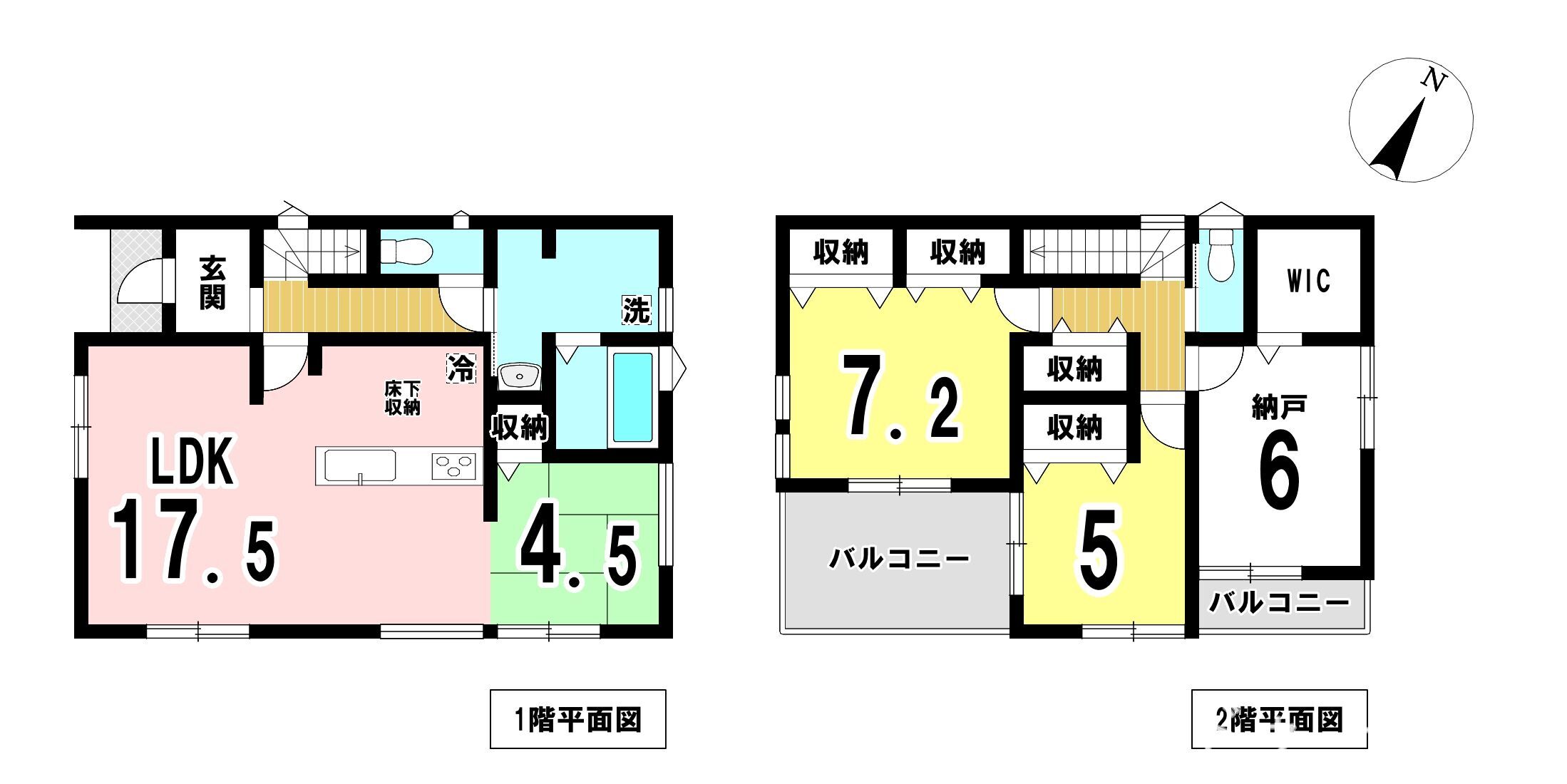 この物件はJR東海道本線「尾張一宮」駅から徒歩約34分、「一宮市第1下沼町 新築分譲住宅」です。周辺は工業地域に該当します。主として工業の業務の利便の増進を図る地域で、住宅やお店も建てられますが、学校、病院、ホテルなどは建てられません。いそむらファミリークリニックまで約460m、V-drug一宮北店まで約460m、テラスウォーク一宮まで約360m、一宮別明郵便局まで約430mと、生活施設が徒歩圏内に整った便利な環境です。貴船小学校まで徒歩約10分、北部中学校まで徒歩約13分です。土地面積は約111.96㎡(約33.86坪)、西側幅員約4.0mの公道に接道しています。建物は木造2階建て、延床面積約100.44㎡(約30.38坪)の2LDK+S。LDKは17帖以上で、全室南向きの明るい住空間が広がります。浴室乾燥機、追焚機能付きバスなど快適な暮らしを支える設備が充実。全居室収納、ウォークインクローゼット、床下収納を備え、使いやすさにも配慮されています。フラット35Sに対応した耐震構造の安心住宅で、駐車スペースは車種により3台分確保。通風・採光に優れ、快適に暮らせる新築住宅です。