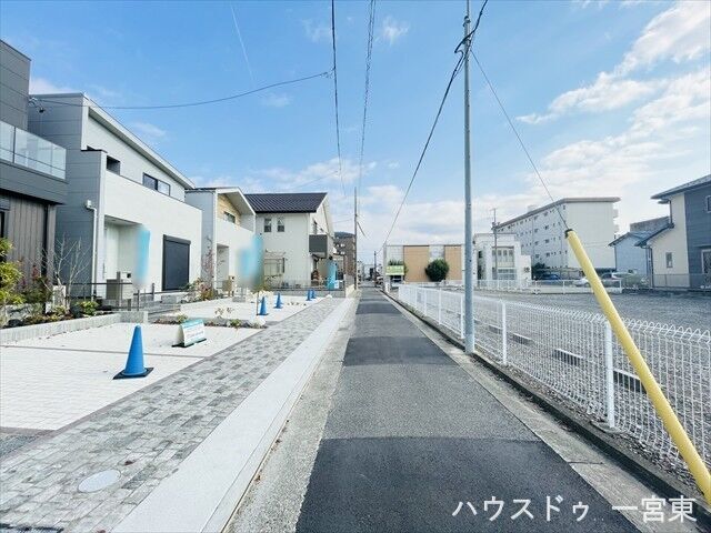 この物件は名鉄名古屋本線「名鉄一宮」駅から西方向へ徒歩約16分、「一宮市平和3丁目 新築分譲住宅」全4棟の1号棟です。周辺は準工業地域に該当し、主として工業の業務の利便の増進を図る地域で、住宅やお店も建てられるエリアです。バロー一宮西店まで徒歩約6分(約470m)、クスリのアオキ一宮住吉店まで徒歩約8分(約640m)、きはしクリニックまで徒歩約10分(約760m/車で約3分)など、各種施設が徒歩圏内に揃っています。神山小学校まで徒歩約5分(約340m)、中部中学校まで徒歩約14分(約1060m)。駅まではほぼ平坦な道のりで、区画整理も進んだエリアです。敷地は約145.18㎡(約43.91坪)で、南側幅員約2.3m・西側幅員約3.4mの公道に接しています。建物は木造2階建て・延床約129.19㎡の4LDK+Sで、主要採光は南向き。LDK18帖以上、食洗機付きのシステムキッチン、浴室暖房乾燥機、豊富な収納、インナーバルコニー、宅配BOXなど設備も充実。駐車スペースは普通車2台分を確保し、角地につき採光と通風にも恵まれた住まいです。